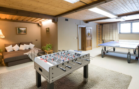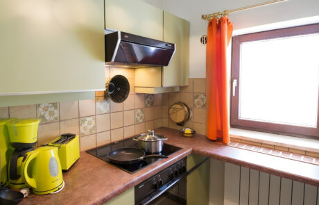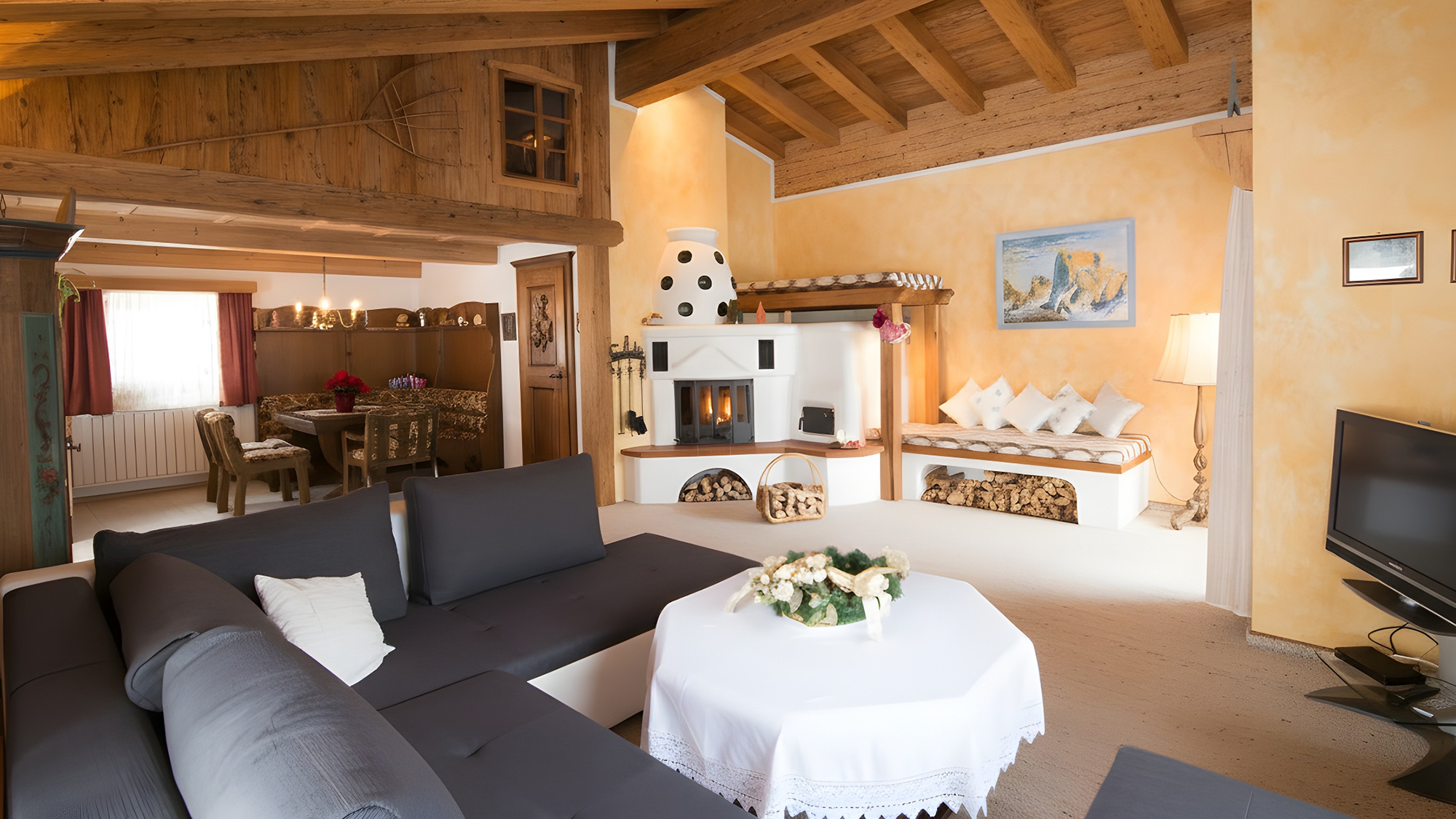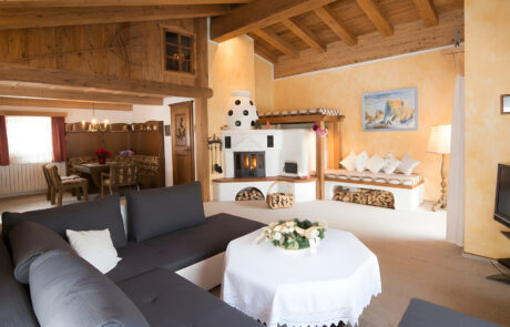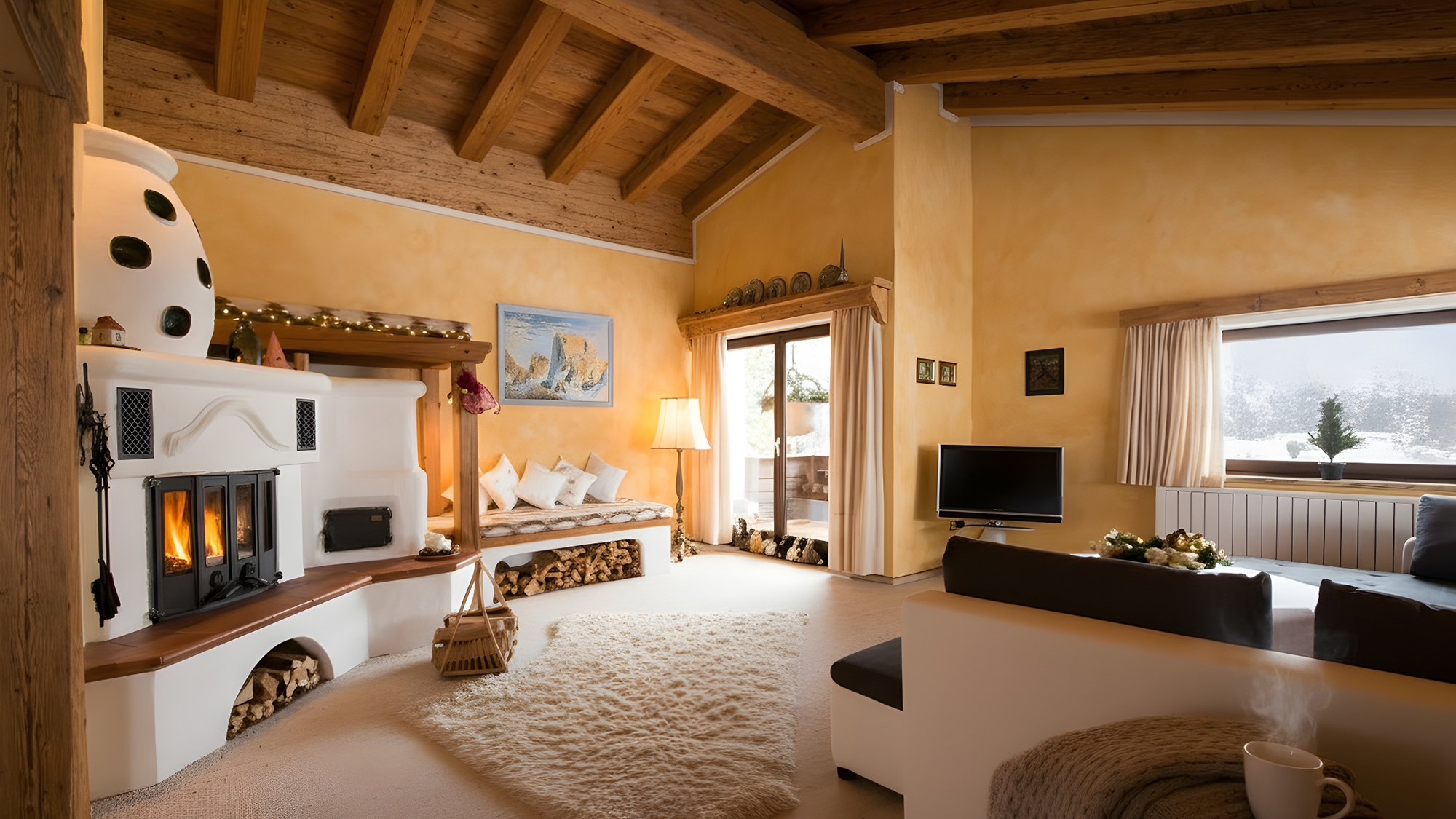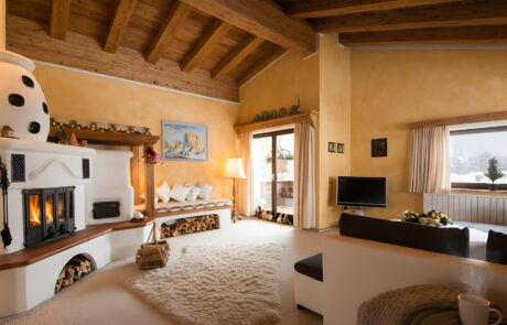 Schon beim Eintreten spürt man die warme, gemütliche Atmosphäre, die sich durch alle Räume zieht. Das großzügige Ferienhaus bietet reichlich Platz – ideal auch für zwei Familien. Zwei Badezimmer sorgen für Komfort ohne Gedränge. Im Mittelpunkt steht das große Wohn- und Esszimmer mit bis zu vier Meter hoher Altholzdecke, Kamin und Kachelofen – ein Ort für entspannte Stunden. Ein besonderes Highlight ist die Hochliege auf dem Ofen – perfekt zum Träumen und Aufwärmen. Die Küche ist voll ausgestattet mit Herd, Backofen, Geschirrspüler, Kühlschrank, Kaffeemaschine, Toaster und Wasserkocher. Auch an Allergiker ist gedacht: Bettwäsche und Polster sind allergikerfreundlich – für erholsame Nächte im Haus Donnerkogelblick.