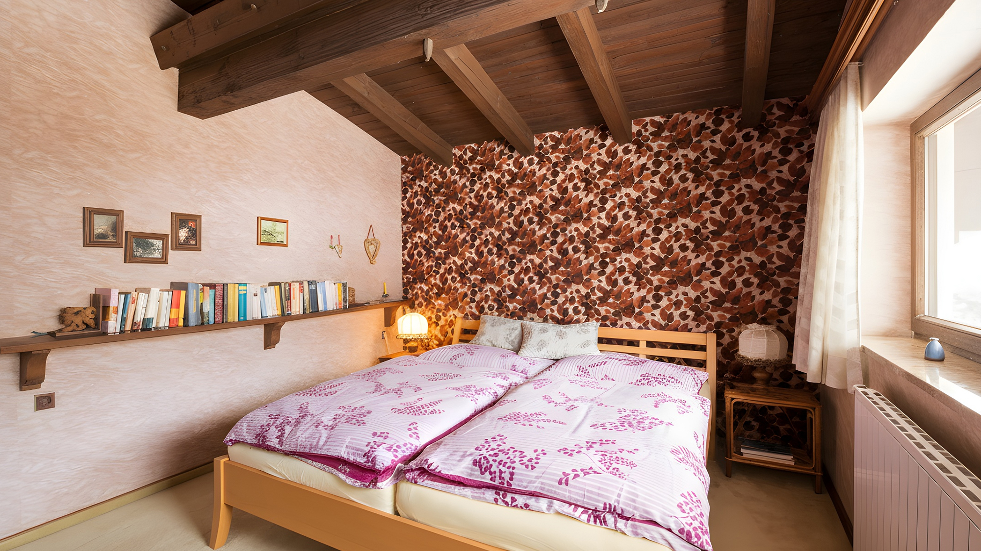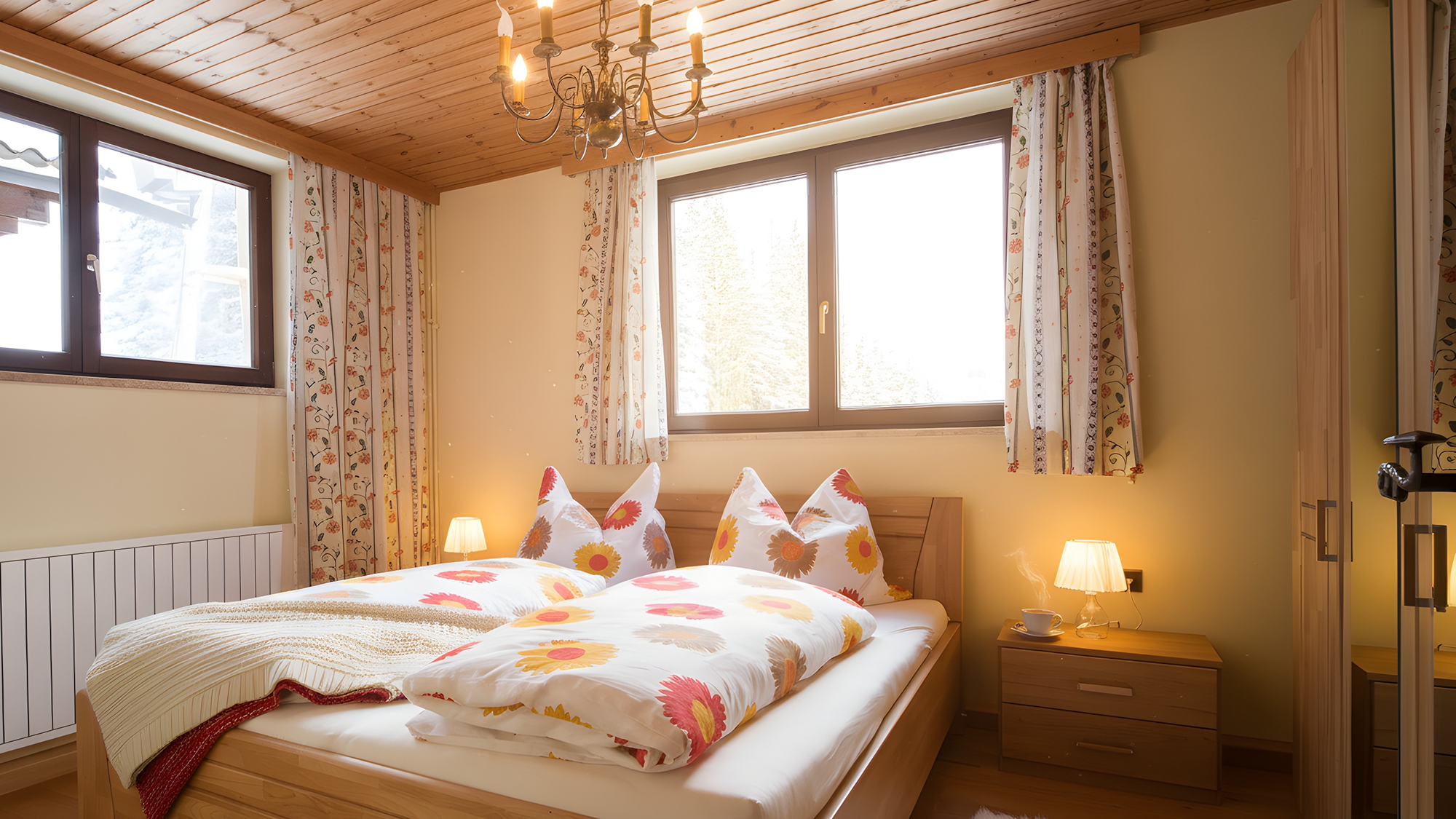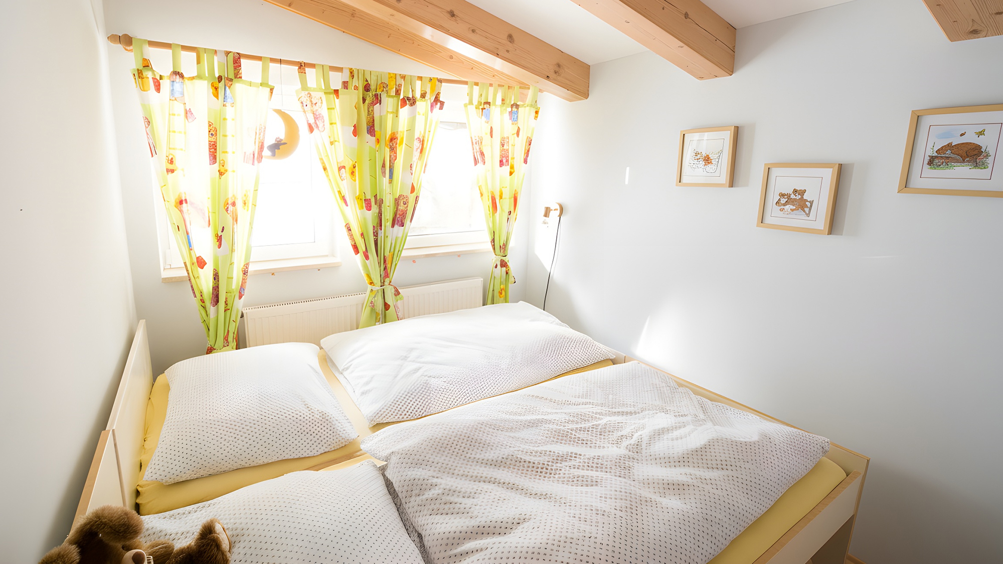 Auch die jüngsten Gäste haben im Haus Donnerkogelblick ihr eigenes Reich. Zwei helle, freundliche Zimmer warten auf sie – eines davon mit einem breiten Doppelbett, das bei Bedarf auch Erwachsenen erholsamen Schlaf bietet.
