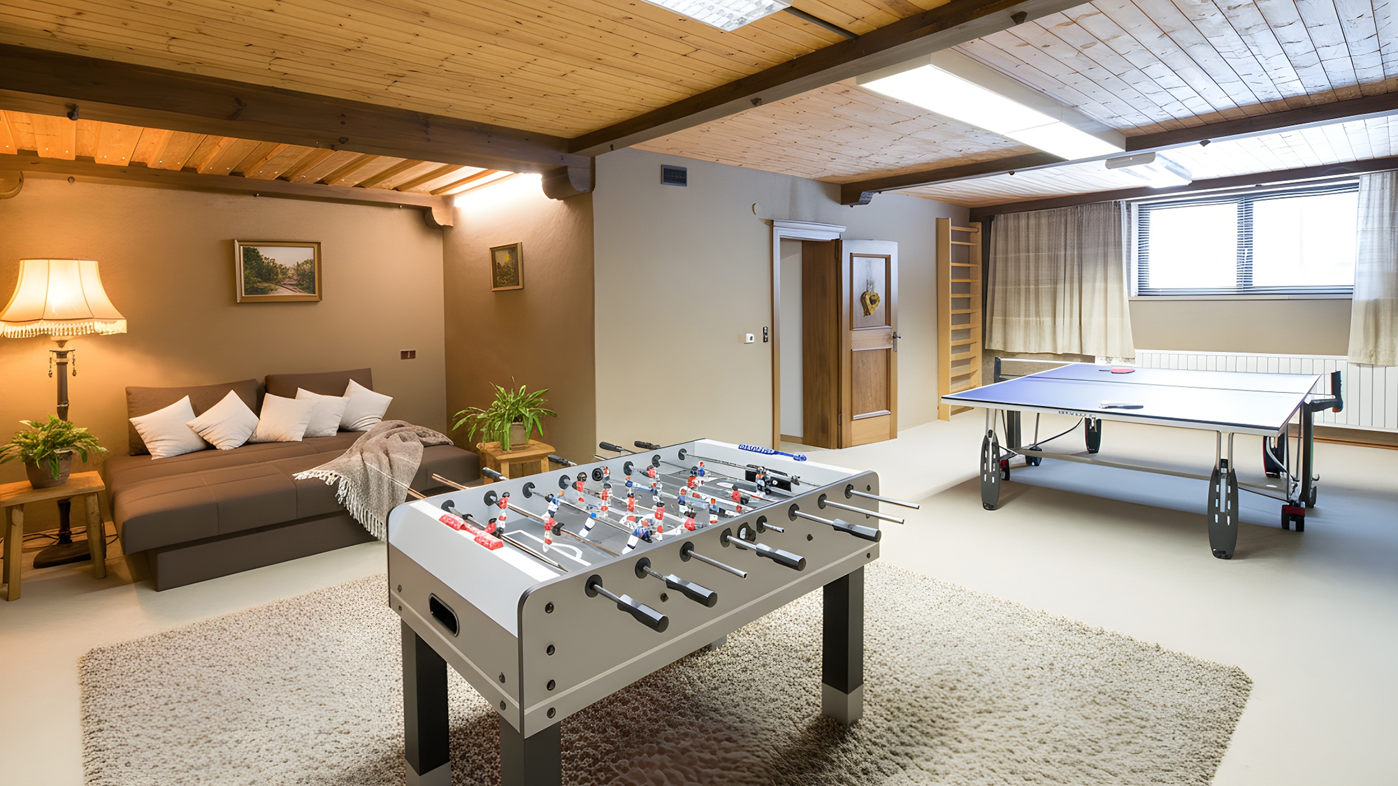 Am Kickertisch werden spannende Matches ausgetragen, während Tischtennisfreunde um Punkte und Ehre kämpfen. Eine schalldämmende Tapete sorgt dafür, dass alle ungestört bleiben, und eine ausziehbare Couch lädt zu einer Pause – oder zum Übernachten – ein.